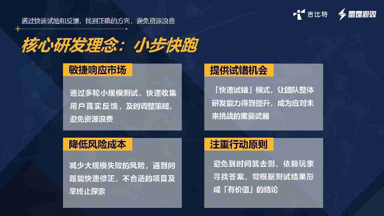 小步快跑不是找答案,,,,而是验证答案。。。我们之前有项目是这样的,,,有些制作人会有几个方向觉得都可以做,,,但是不确定做哪一个,,会选择几个都做,,,做完拿到市场跑,,,,跑出哪一个更好,,,基于这个再做后续的研发和拓展。。。但这种情况最容易出现一个问题,,,,可能被玩家裹胁,,,玩家说这个点不错、、那个点不错,,到底听还是不听,,,,不听感觉是无视玩家的反馈,,听的话,,,,可能自己没想清楚导致研发思路发生偏颇。。。所以针对这一点后面自己复盘整理,,,发现制作人自己心里要有数,,,,要做自己觉得好玩的,,而且明确知道这个东西是你想做的,,然后拿到市场验证这个答案是不是对的,,而不是拿一堆答案找哪一个答案更好。。。